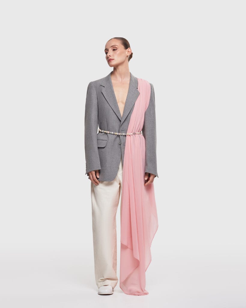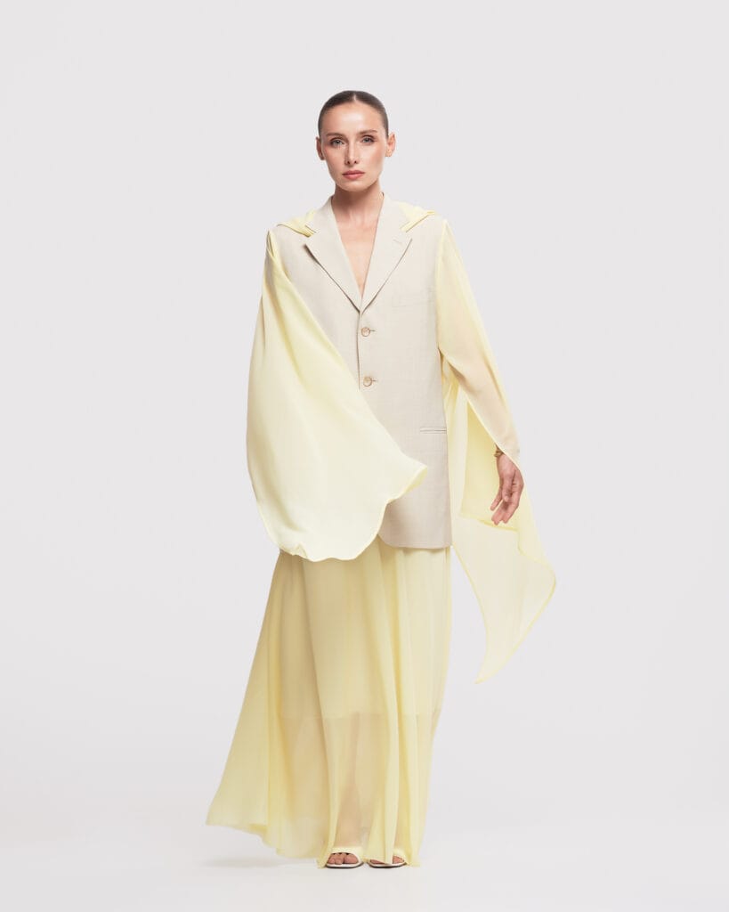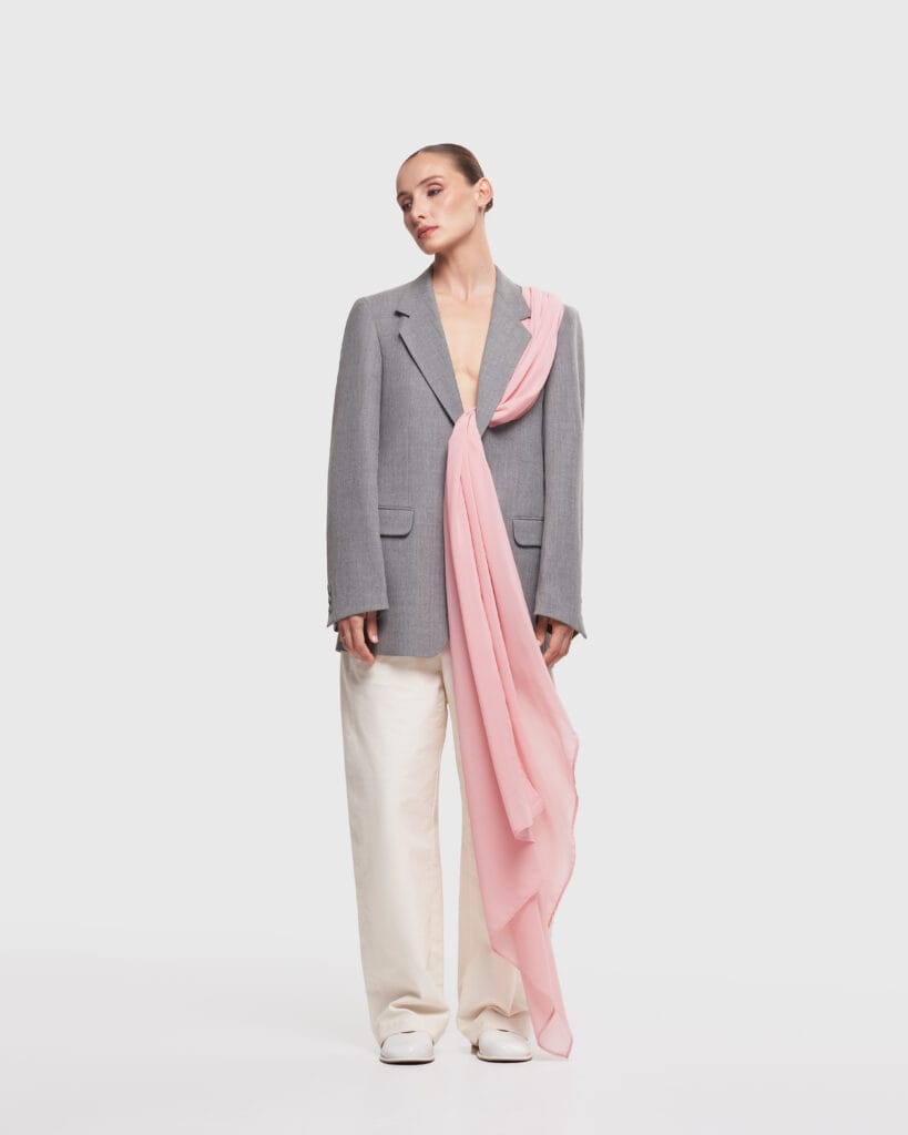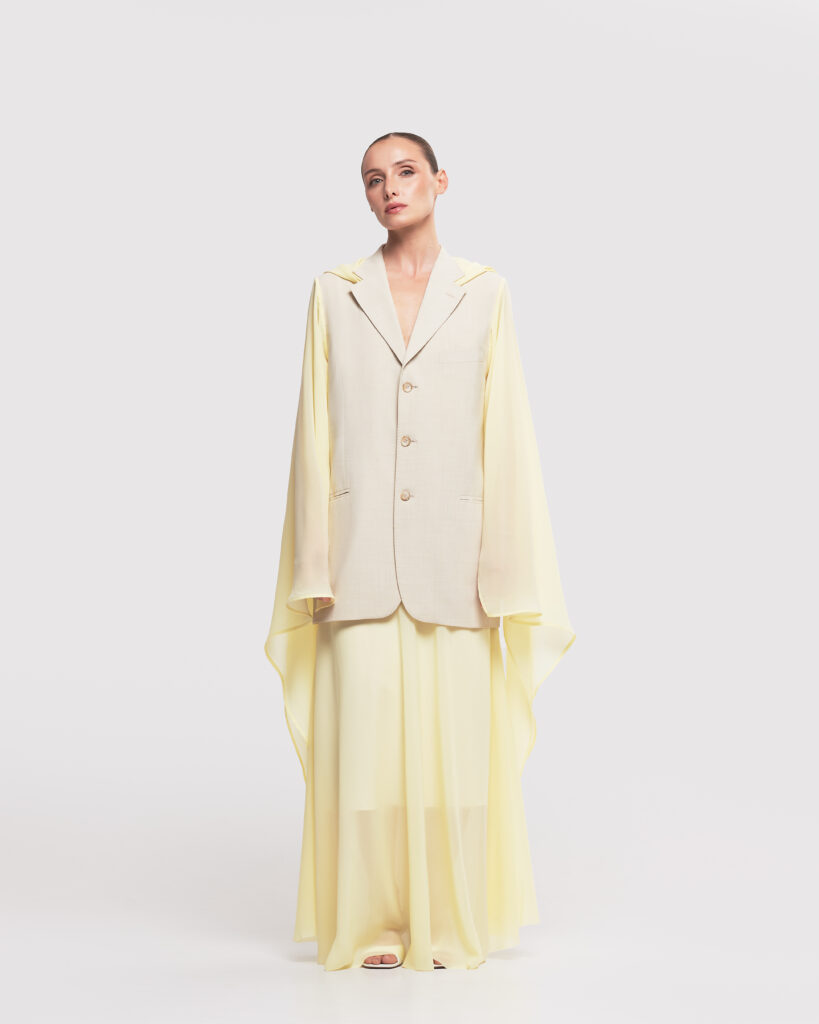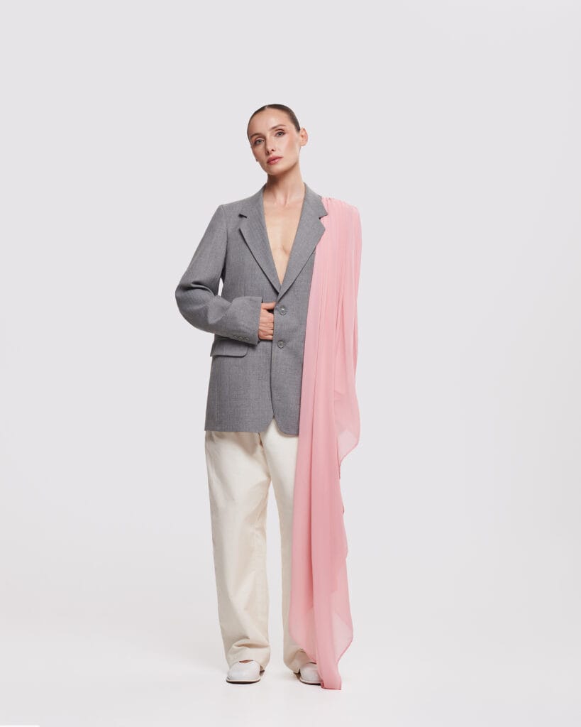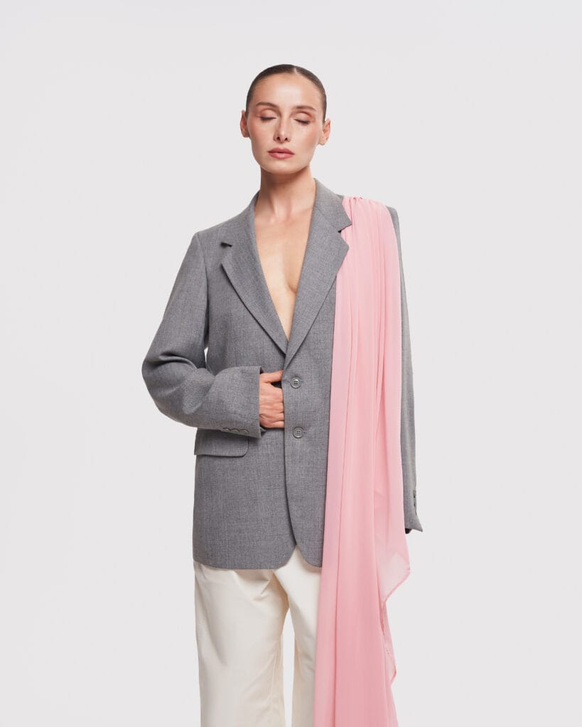 Meticulously deconstructing each jacket, we replace the traditional sleeves with cascading layers of ultra-light chiffon.