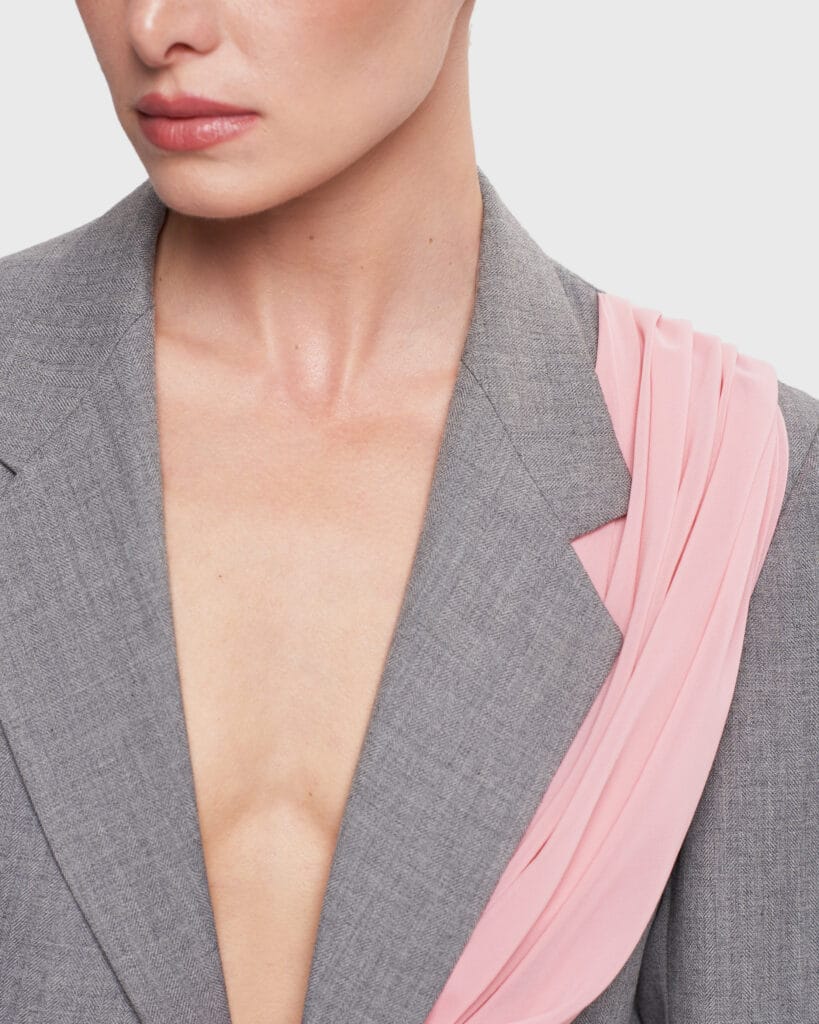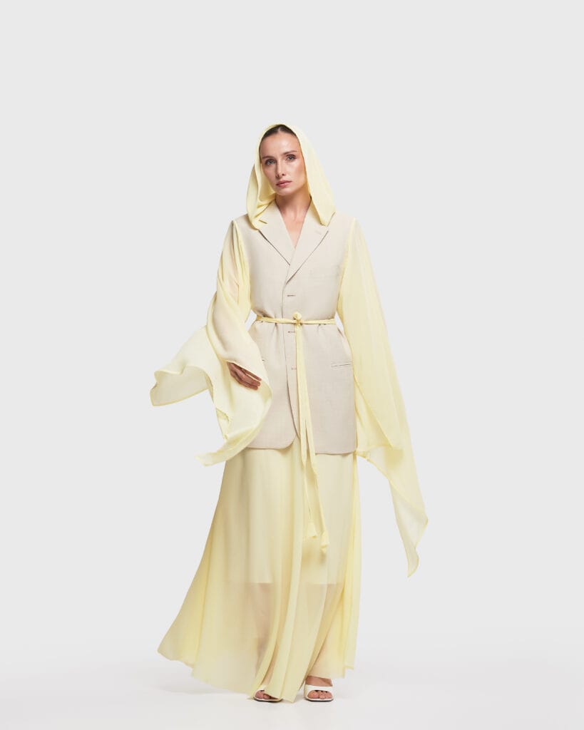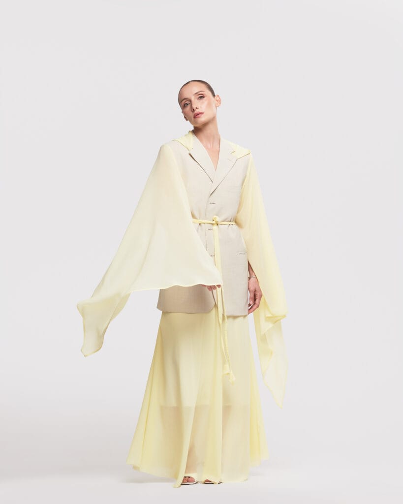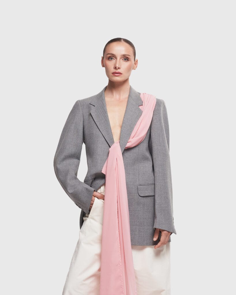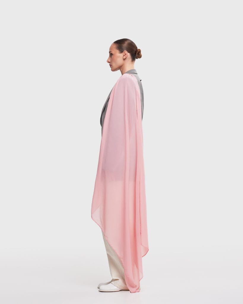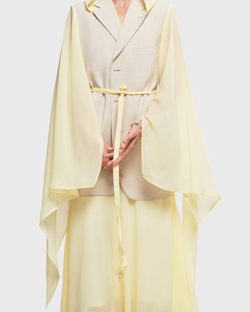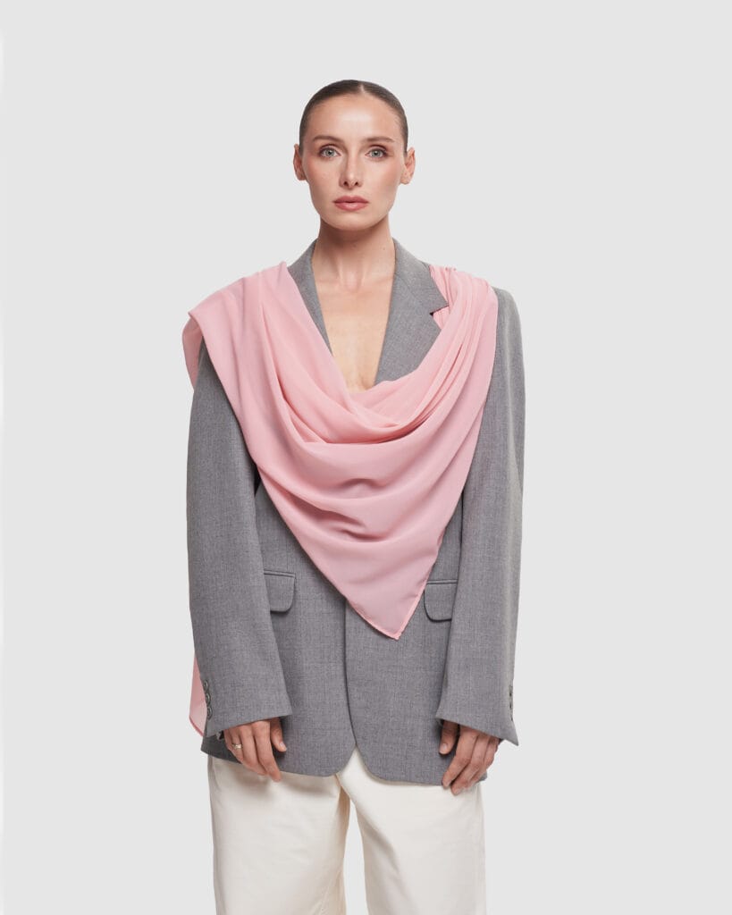 Meticulously deconstructing each jacket, we replace the traditional sleeves with cascading layers of ultra-light chiffon.