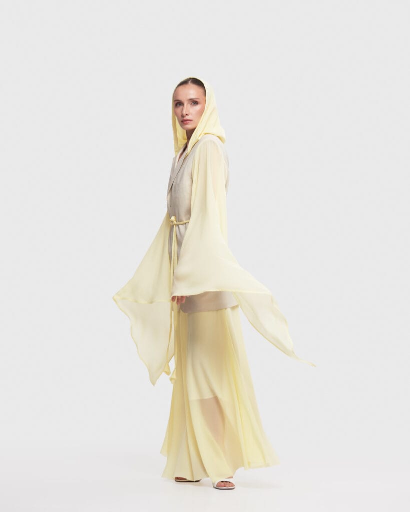 The result is a beautiful contrast: the strong, structured silhouette of the vintage body meets the soft, ethereal flow of the chiffon, which billows and floats with every movement like a pair of delicate angel wings.