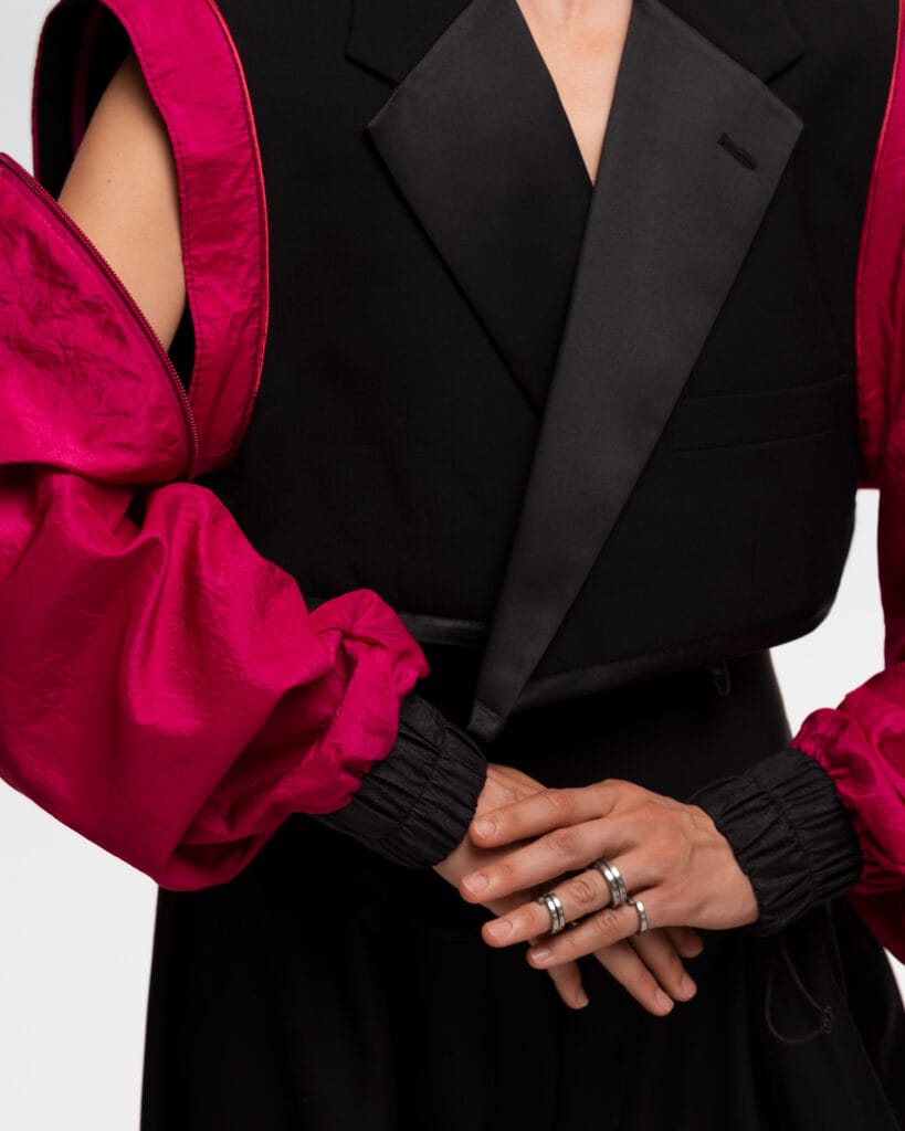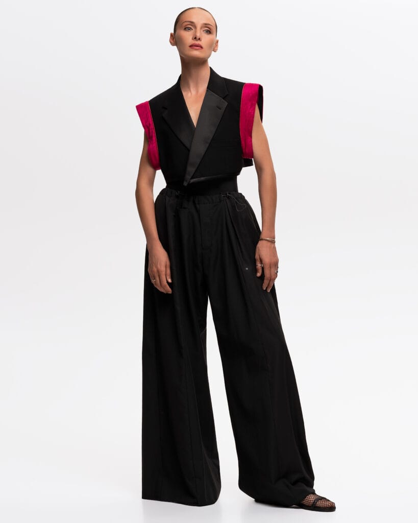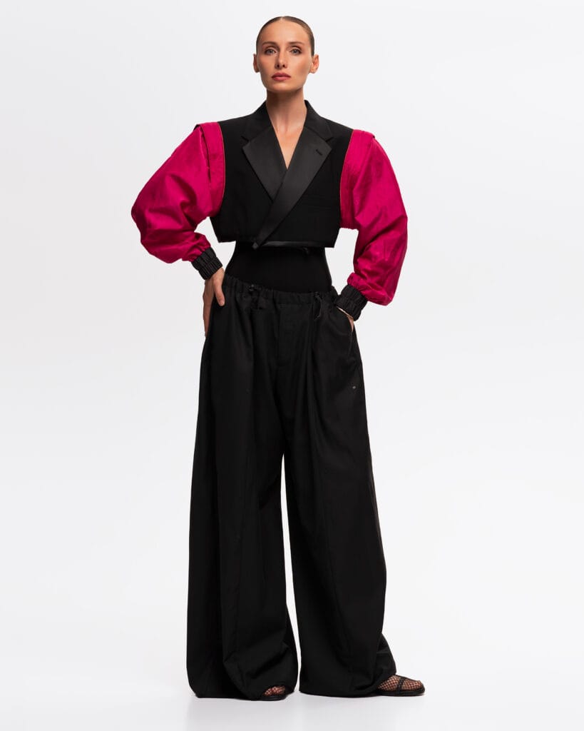 Elegant Contrast: A harmonious blend of structured tailoring and soft, flowing movement.