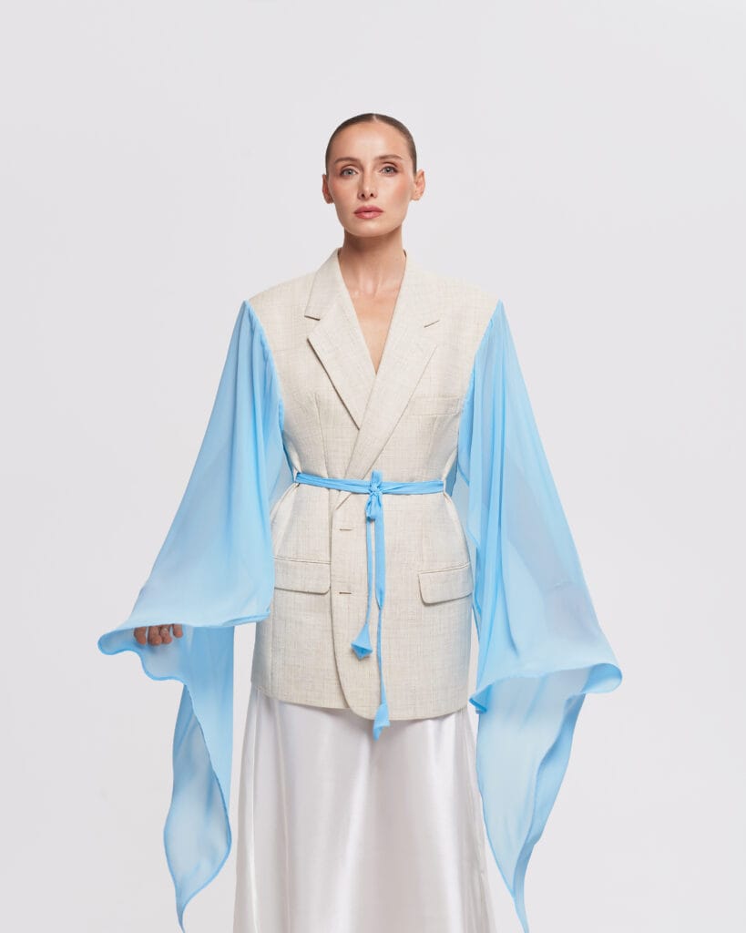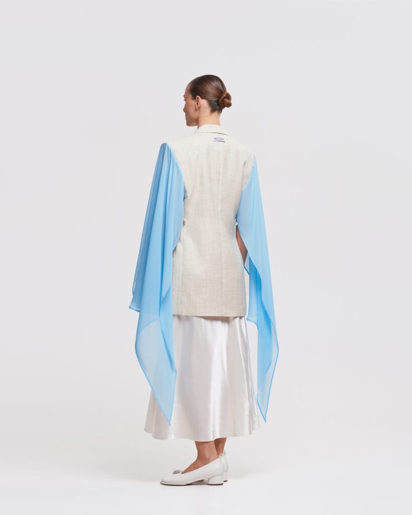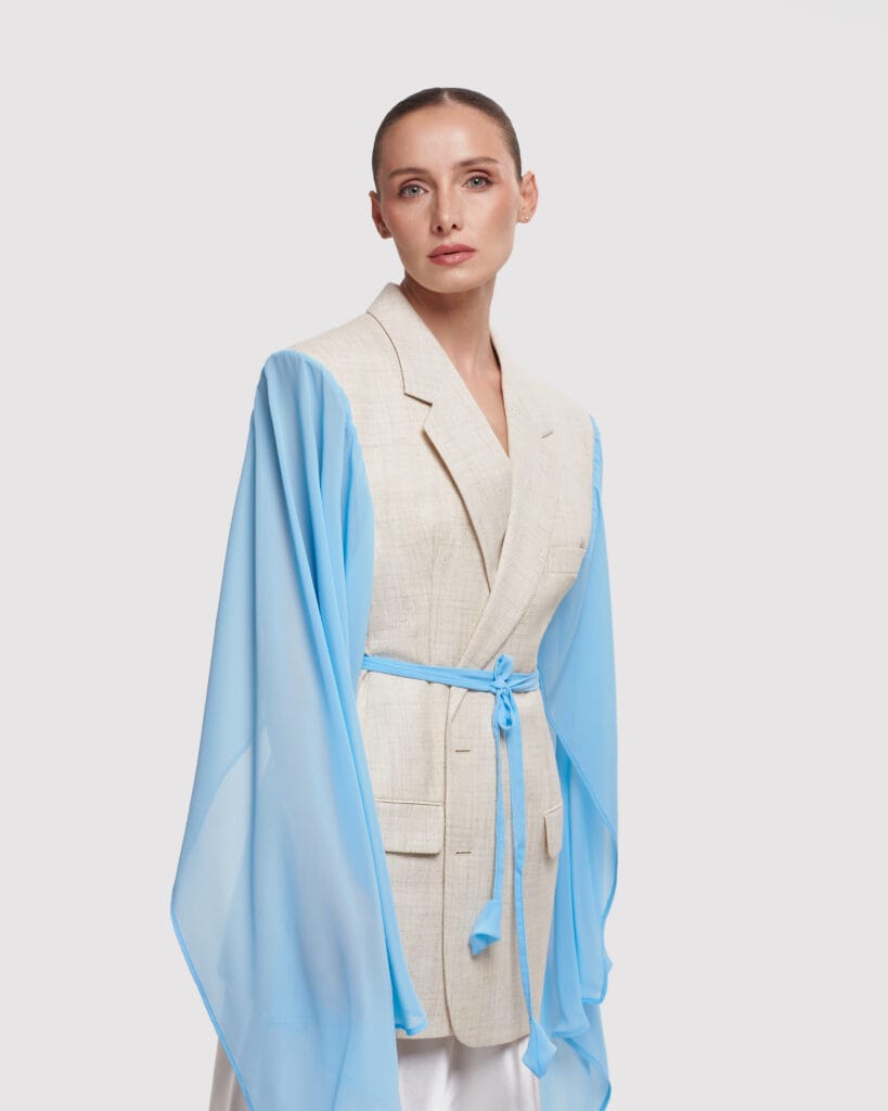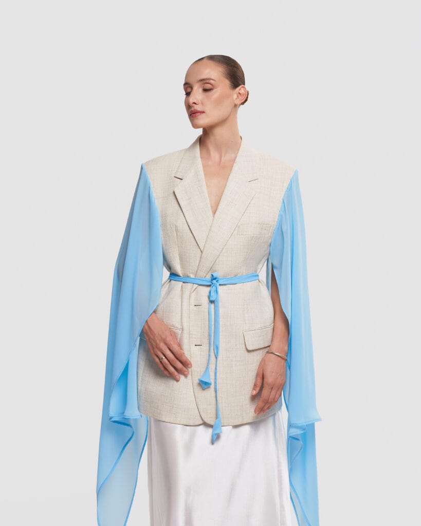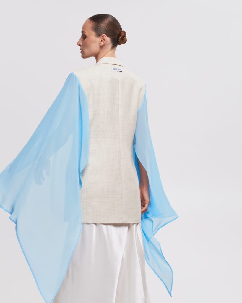 This short sleeve blazer is part of our exclusive upcycled collection, where each piece tells its own story. A one-of-a-kind upcycled blazer featuring a vintage body and dramatic, flowing chiffon detail. This unique piece blends timeless structure with ethereal elegance.
