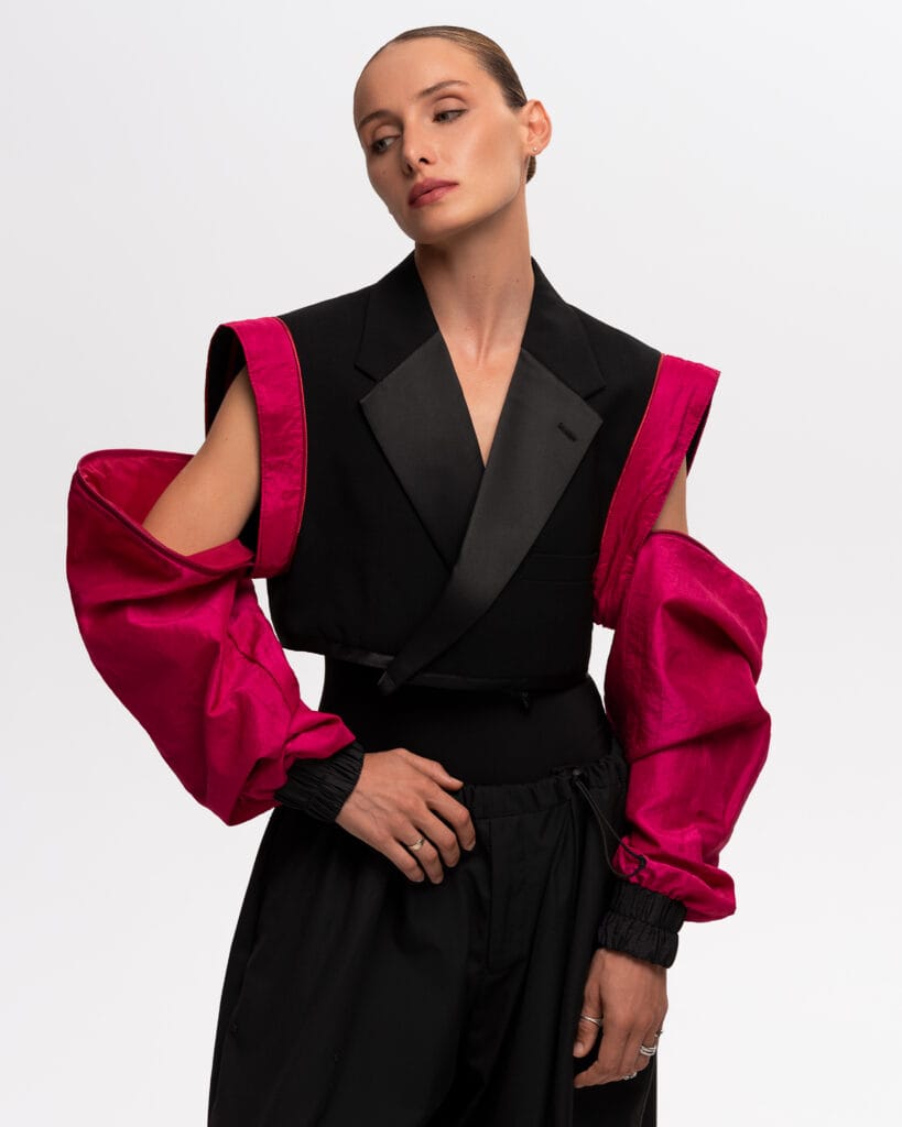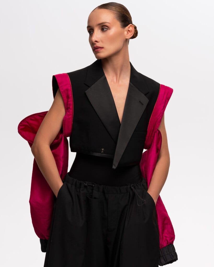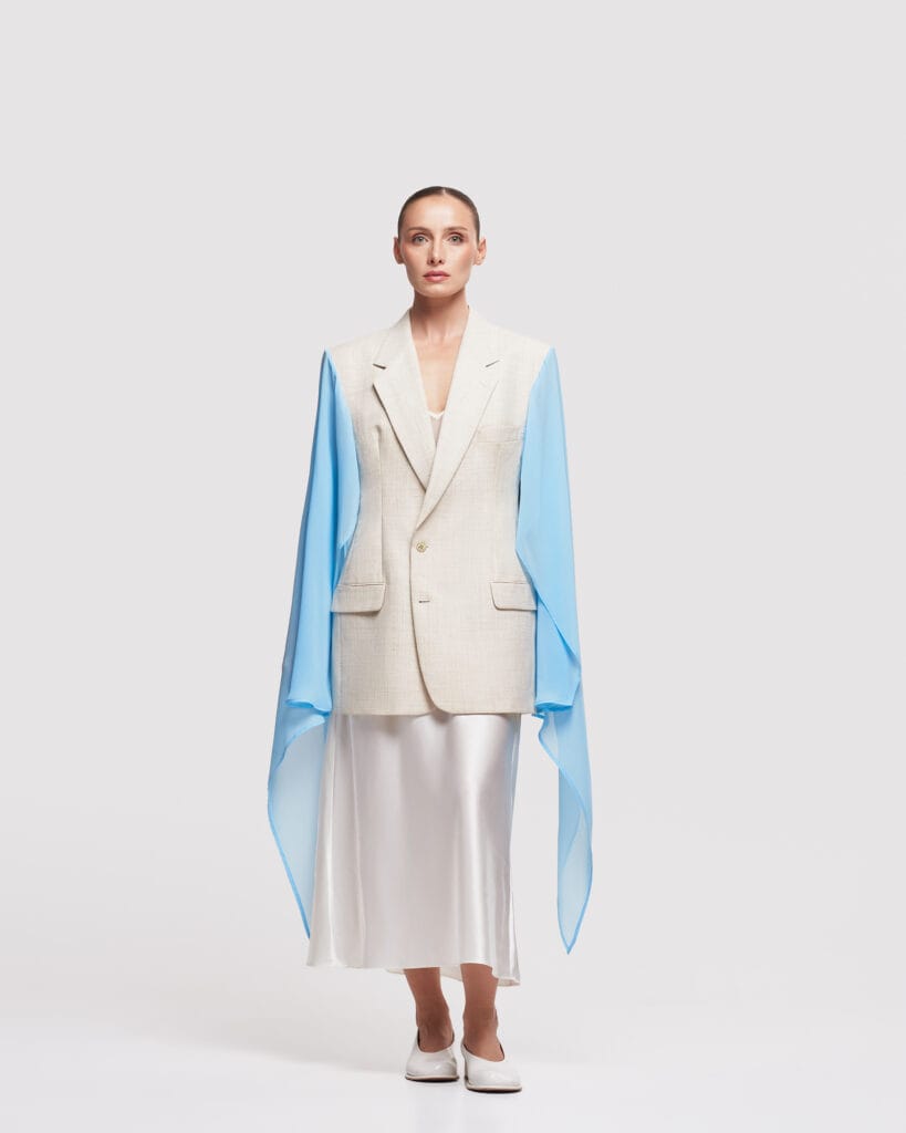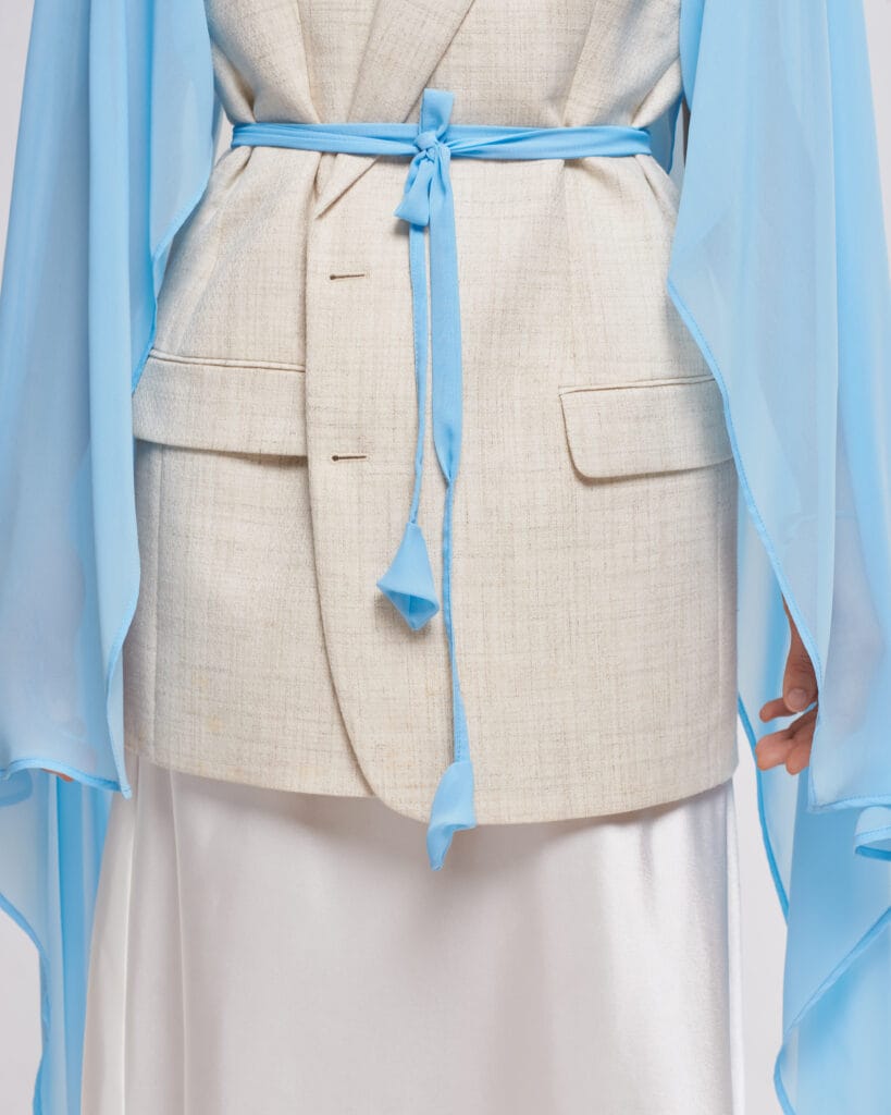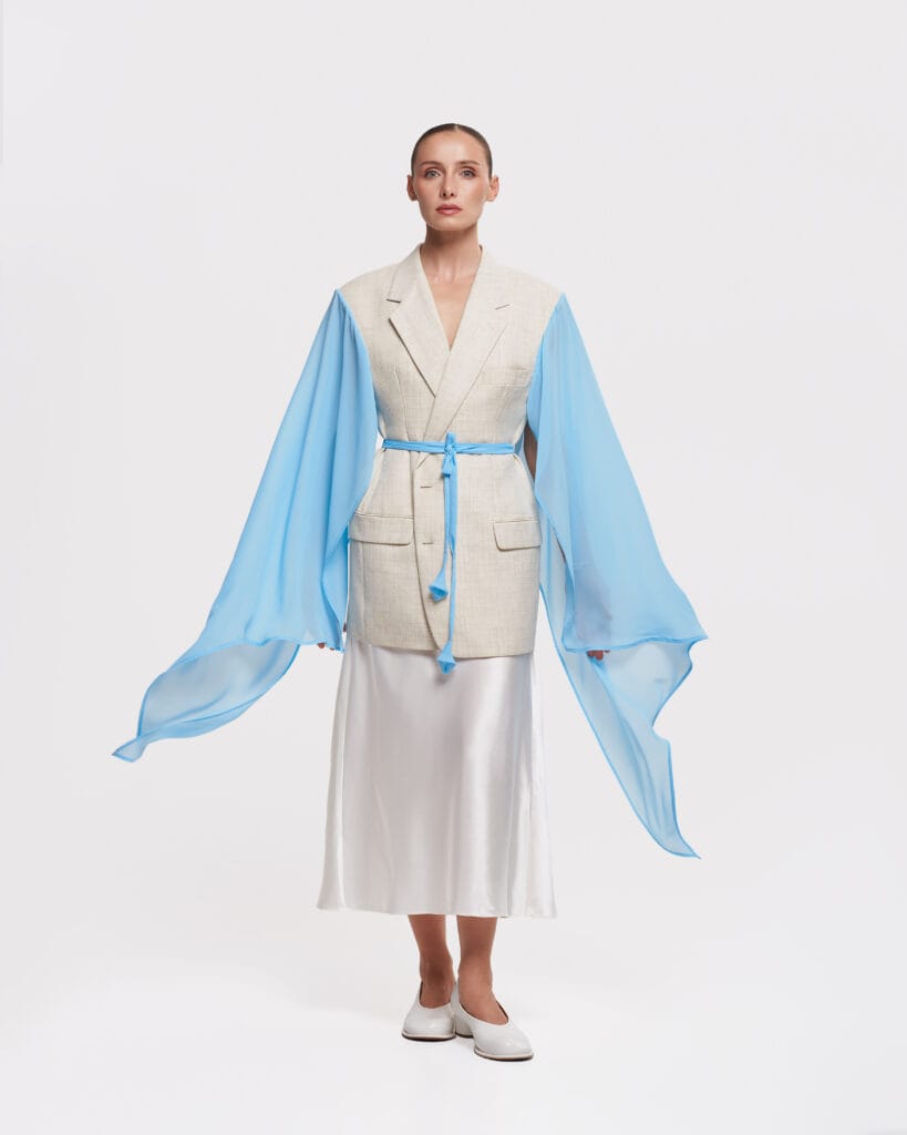 This short sleeve blazer is part of our exclusive upcycled collection, where each piece tells its own story. A one-of-a-kind upcycled blazer featuring a vintage body and dramatic, flowing chiffon detail. This unique piece blends timeless structure with ethereal elegance.