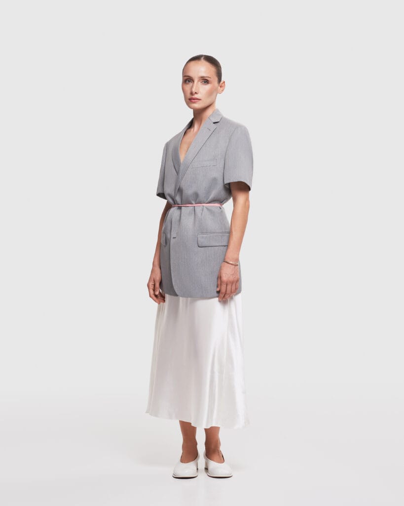 Elegant Contrast: A harmonious blend of structured tailoring and soft, flowing movement.